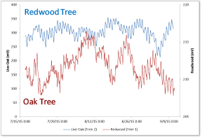 - Oak and redwood trees in different locations at HMI’s California campus and research center have different overall electrical voltage patterns.